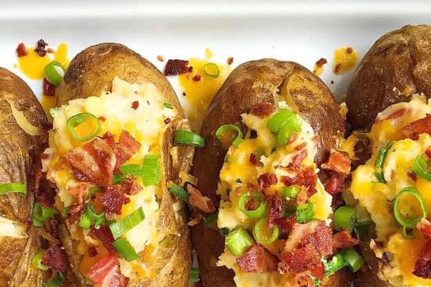 用勺子将混合好的食物填满每个马铃薯的顶部。,撒上剩余的奶酪,并再次在烤箱直至融化约5分钟。 顶部撒上葱段、剩余的培根。