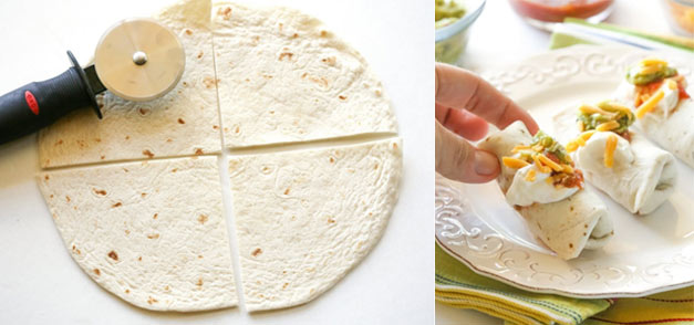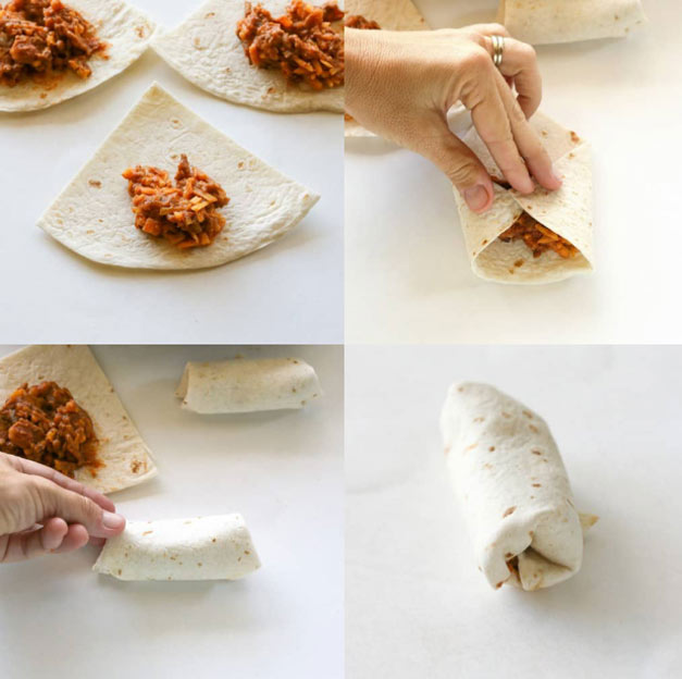用小刀或比萨饼切片机将每个面粉玉米饼切成四分之一,切成4个楔子。在每个玉米饼的较宽部分上,将约2汤匙的肉混合物捞起。将侧面折入并朝小端卷起,