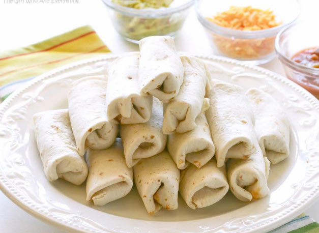 我尝试了几种不同的滚动方式,发现将肉混合物放在玉米饼的宽端朝着小端滚动是最好的。将它们放在烤盘中,直到热为止。